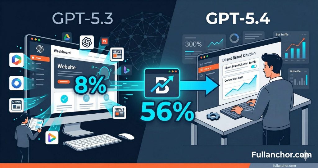 El 8 de marzo de 2026, Samanyou Garg, fundador de Writesonic, publicó un estudio que ha sacudido la comunidad SEO y AEO de manera profunda. Su equipo analizó 50 prompts en ChatGPT usando cuatro modelos diferentes, extrajeron cada consulta de búsqueda enviada, cada resultado web recuperado y cada citación incluida en las respuestas. El hallazgo principal es tan sorprendente que merece repetirse: el 56% de las citaciones de GPT-5.4 van directamente a los sitios web de las marcas. En GPT-5.3, el modelo por defecto que usa la mayoría de usuarios, ese porcentaje es solo del 8%.